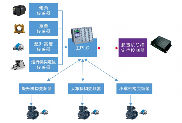 系统概述系统由主PLC、 防摇定位控制器、高度传感器、重量传感器、倾角传感器以及位置传感器组成。各个控制器及传感器之间使用Profinet协议进行数据通讯。