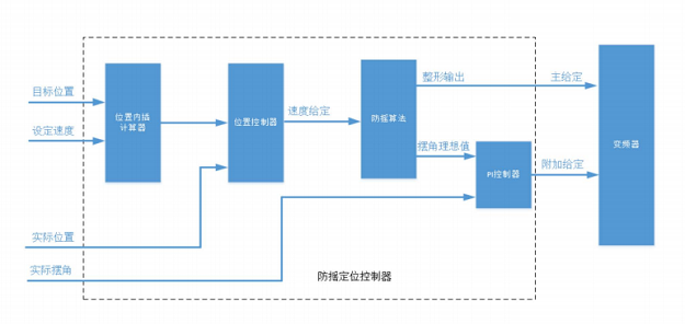 基于位置控制的防摇系统通过采集负载单摆周期、提升和平移机构的速度、加速度、三轴位置值等参数,经过综合建模计算出起重机平移机构实时速度给定值,驱动装置以该速度给定值驱动平移机构运行,实现防摇控制和高精度定位。该系统可以有效抑制位能负载吊运过程中产生的摇摆,减少物料摇摆带来的机械冲击,同时实现高精度定位,提高作业效率。